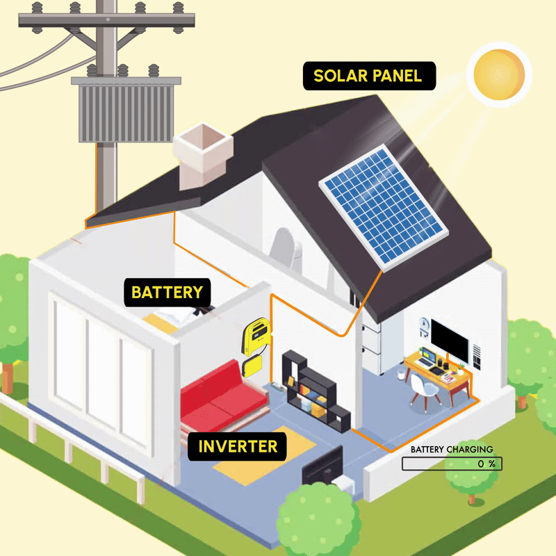 - La batterie stocke à la fois l’énergie produite par le réseau et l’énergie solaire permettant de faire fonctionner les appareils durant la nuit ou lorsque le réseau électrique n’est pas disponible.